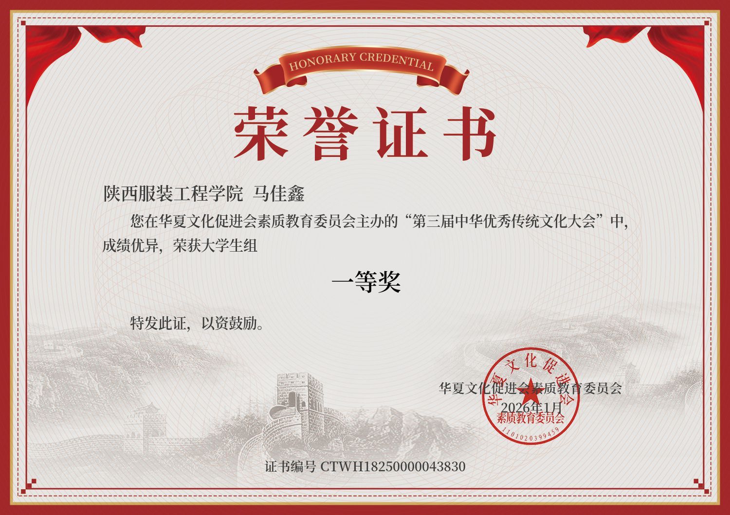 陕服工会网讯(高洋斌)为全面贯彻落实党的二十大精神,深入挖掘中华优秀传统文化价值内涵,引领学生自觉接受中华优秀传统文化的熏陶,树立健康向上的审美观和正确的价值观,推动学生树立高度的文化自信、清晰的文化自觉和正确的文化认同,应用技术学院工会组织学生参加第三届中华优秀传统文化大会,有2名来自于铁道机车车辆制造与维护专业的同学获得“一等奖”。
